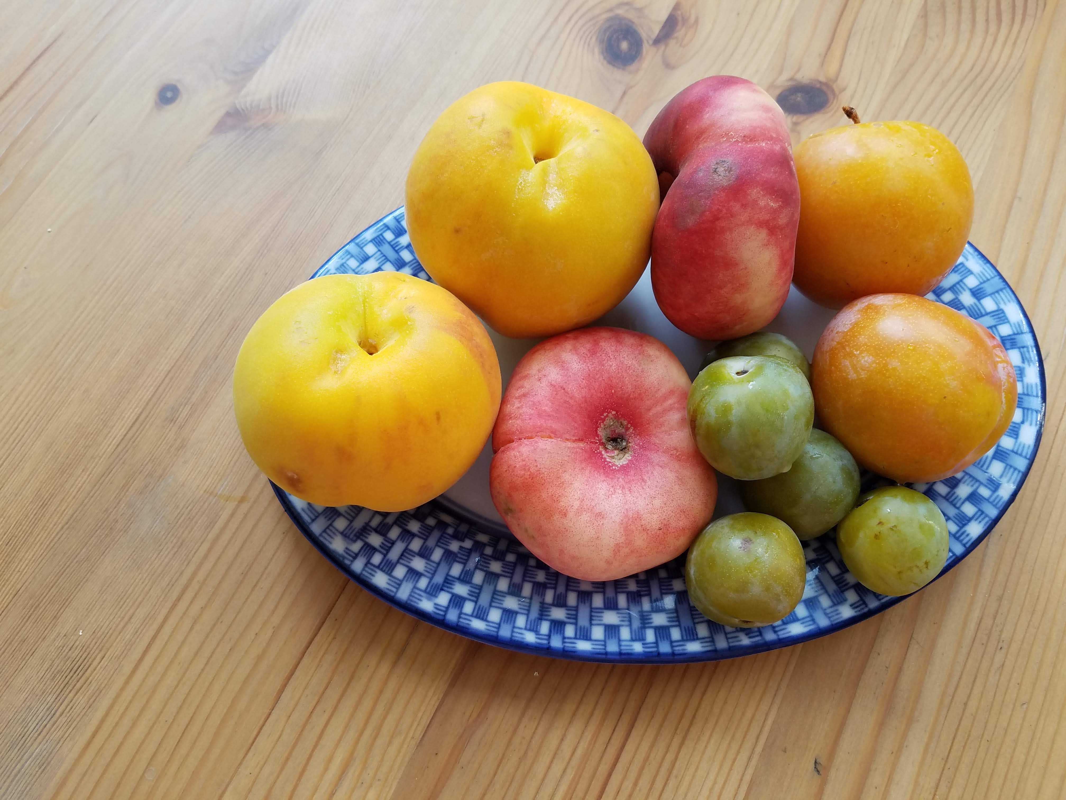 Pictured here are seasonal fruit finds, variations on familiar things from home: the large yellow peaches taste almost apricot-like, the flat peaches have a small pit and flesh with a more plum-like consistency (but different from a nectarine). Many varieties of tomatoes abound.