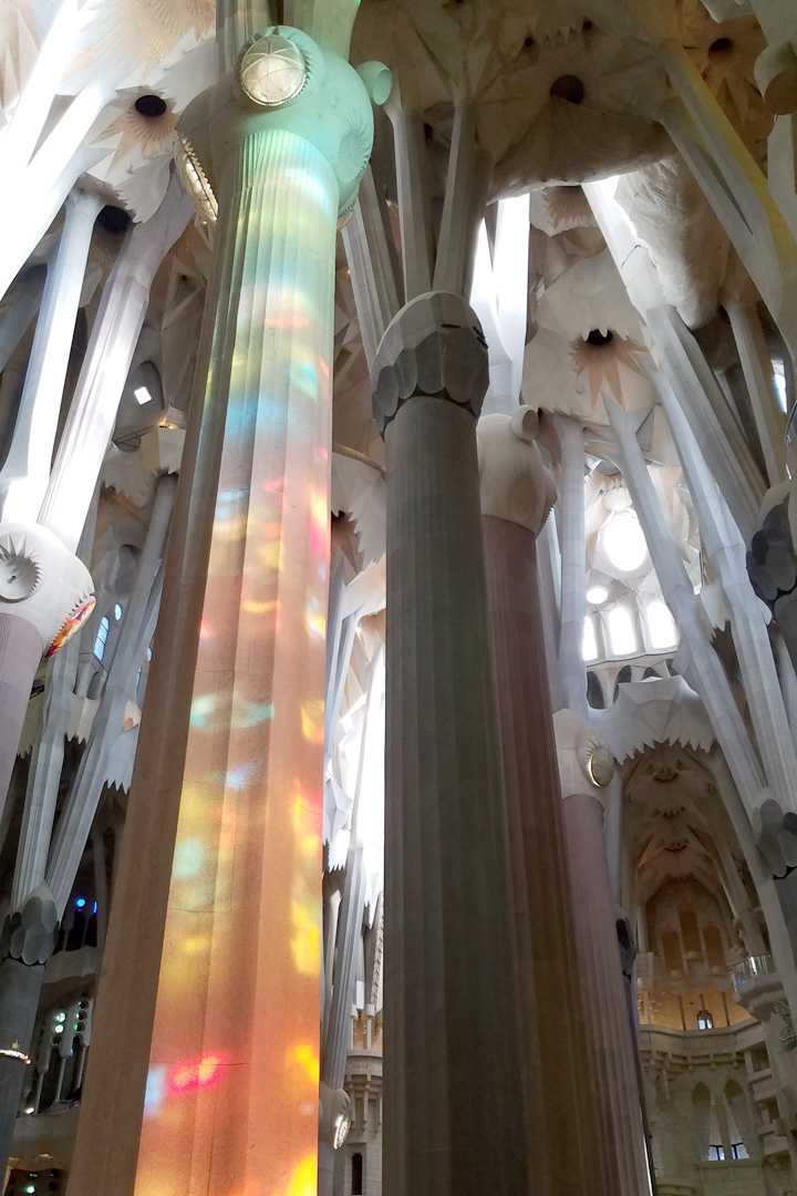 The sculptural monochrome stonework has a different sensibility from the riot of colors of Gaudi's famous tile work. Here the stained glass provides a rainbow of brilliant color, in counterpoint to the neutral masonry. The low winter sun poured through the windows, washing parts of the interior with color.